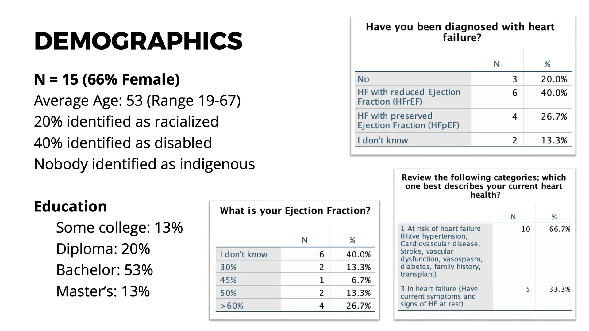 Our initial cohort includes 15 patient partners who participated in the Masterclass for Patient Partners Engaging in Cardiovascular Research workshop at Vascular 2023. The diverse group has 66% female participants, an average age of 53, and varied educational backgrounds.