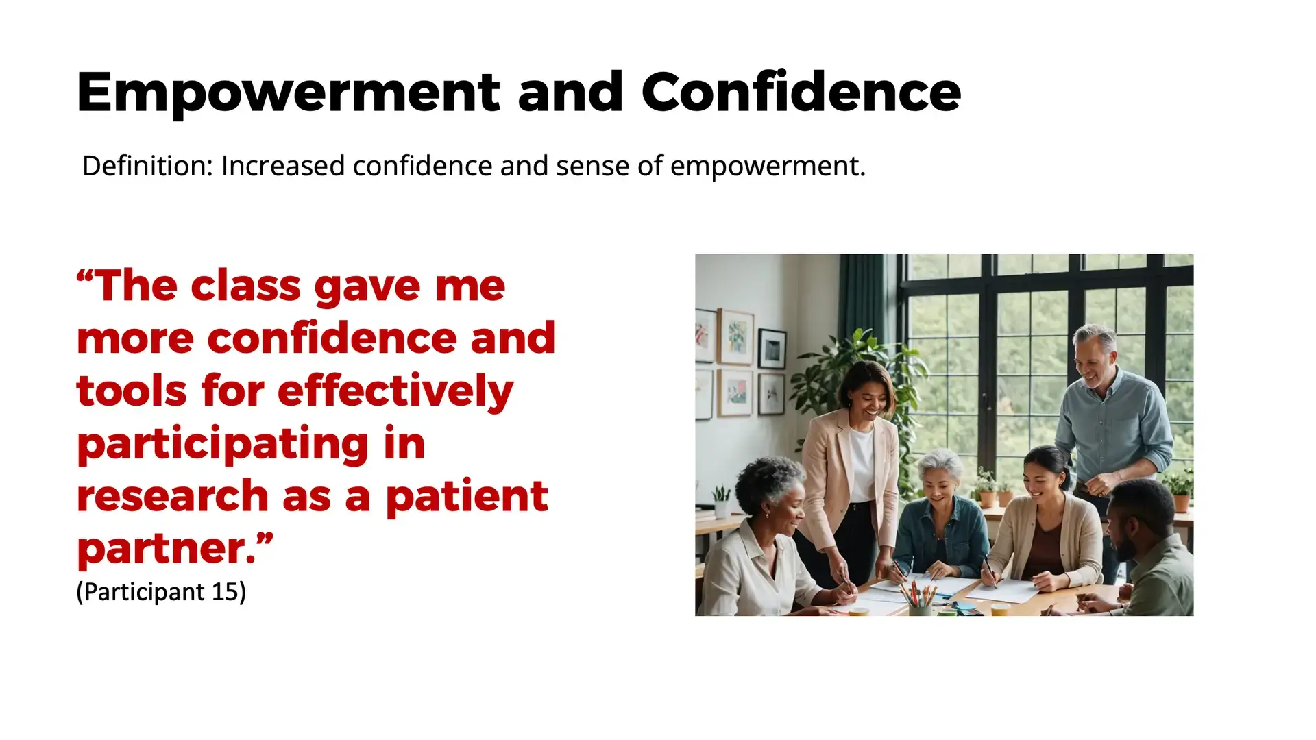 • “The class gave me more confidence and tools for effectively participating in research as a patient partner.” (Participant 15)