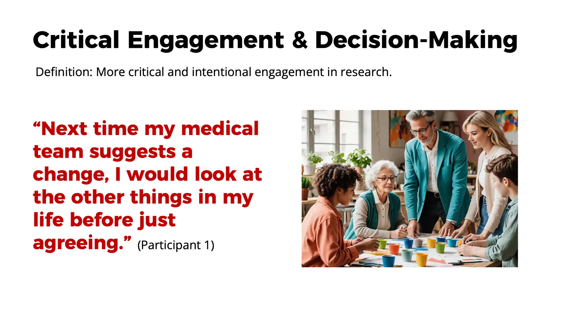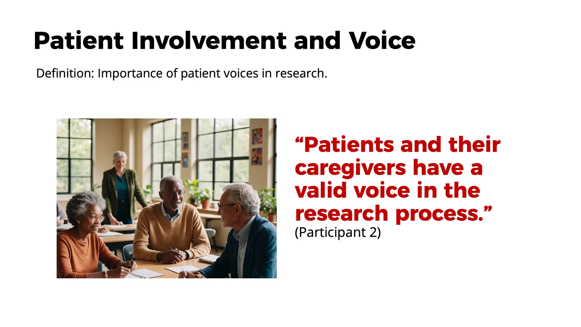 • “Patients and their caregivers have a valid voice in the research process.” (Participant 2)