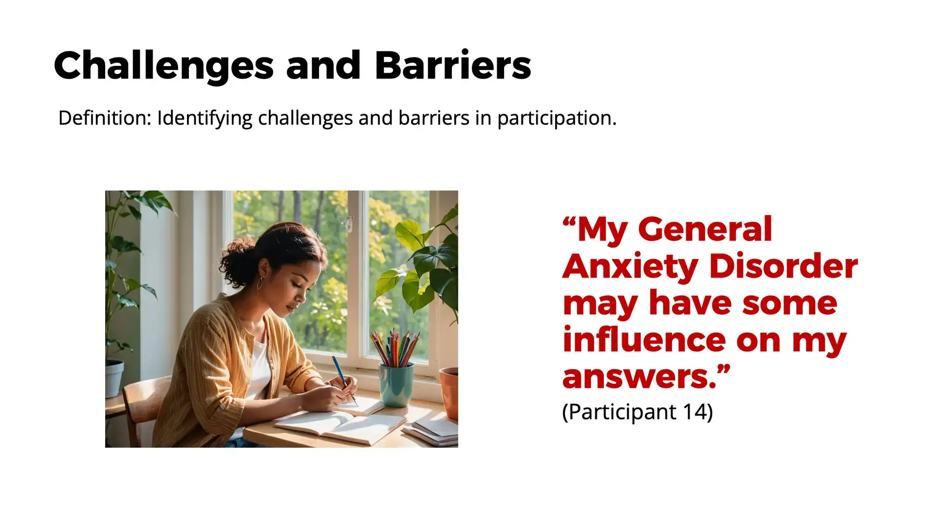 • “My General Anxiety Disorder may have some influence on my answers.” (Participant 14)