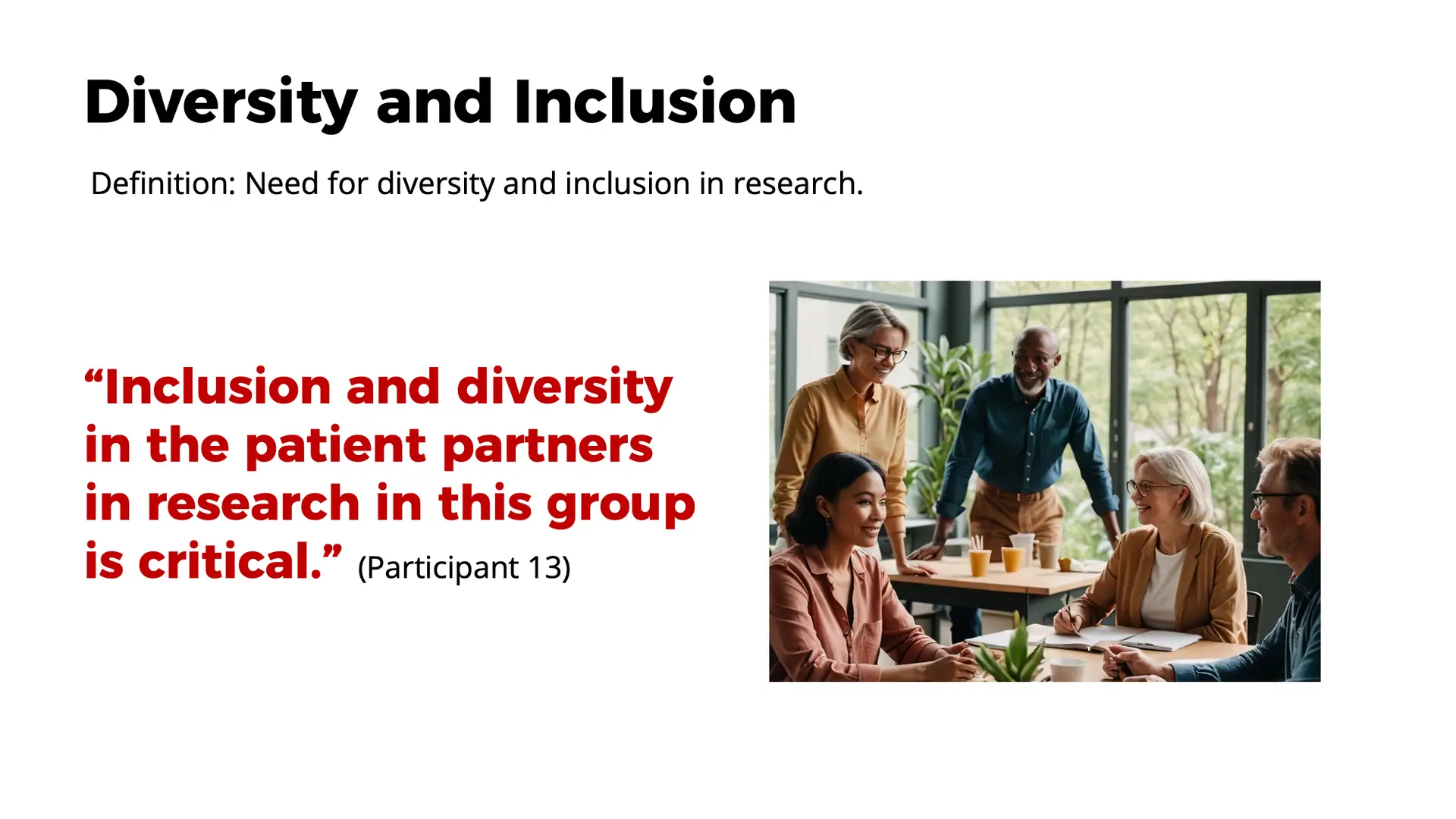 • “Inclusion and diversity in the patient partners in research in this group is critical.” (Participant 13)