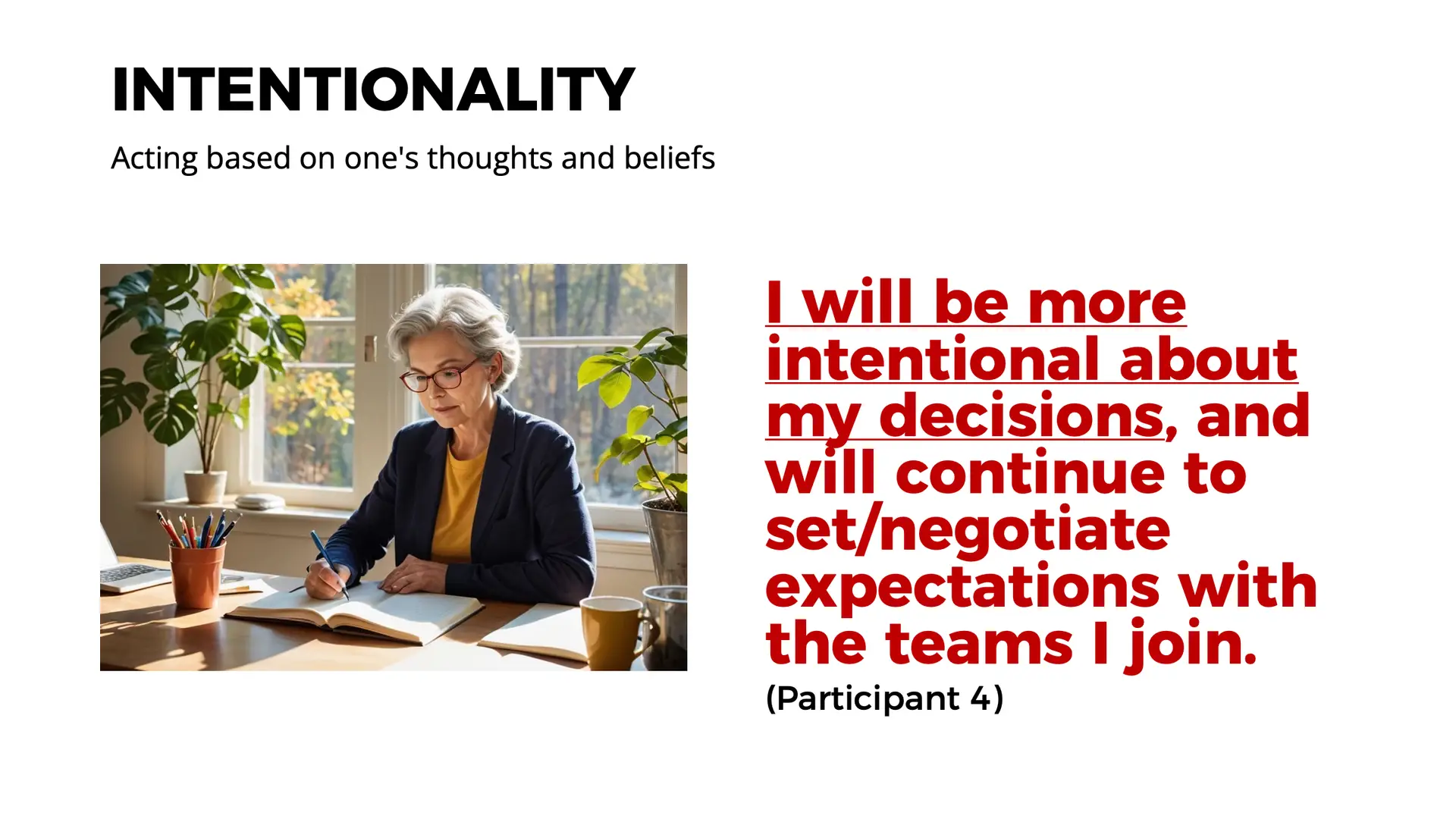 • “Next time my medical team suggests a change, I would look at the other things in my life before just agreeing.” (Participant 1)