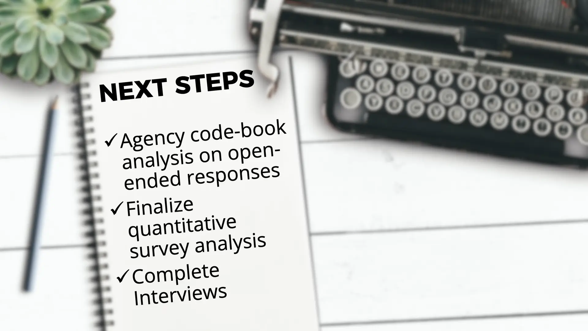 Our next steps include finalizing the quantitative survey analysis, completing interviews, and developing an agency codebook to analyze open-ended responses further.