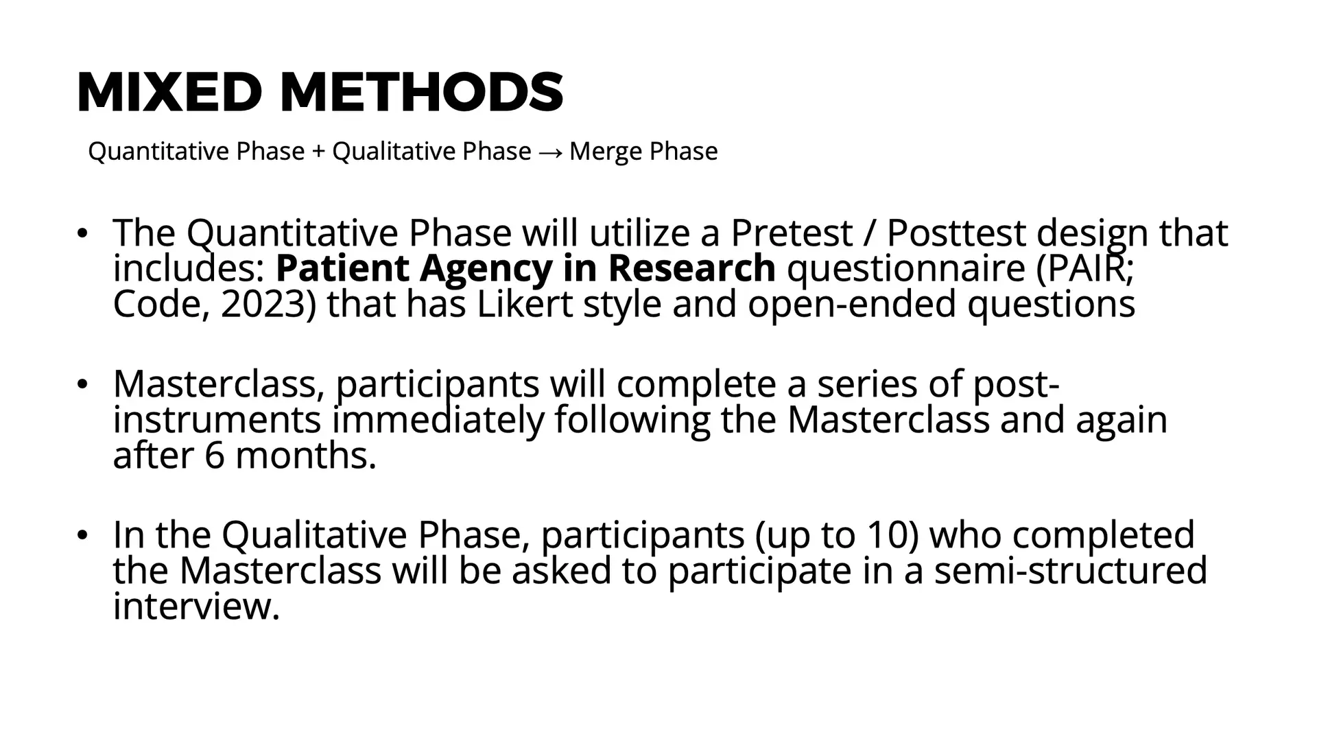 The study employs a mixed-methods approach, combining quantitative surveys and qualitative interviews to understand patient agency in research comprehensively.